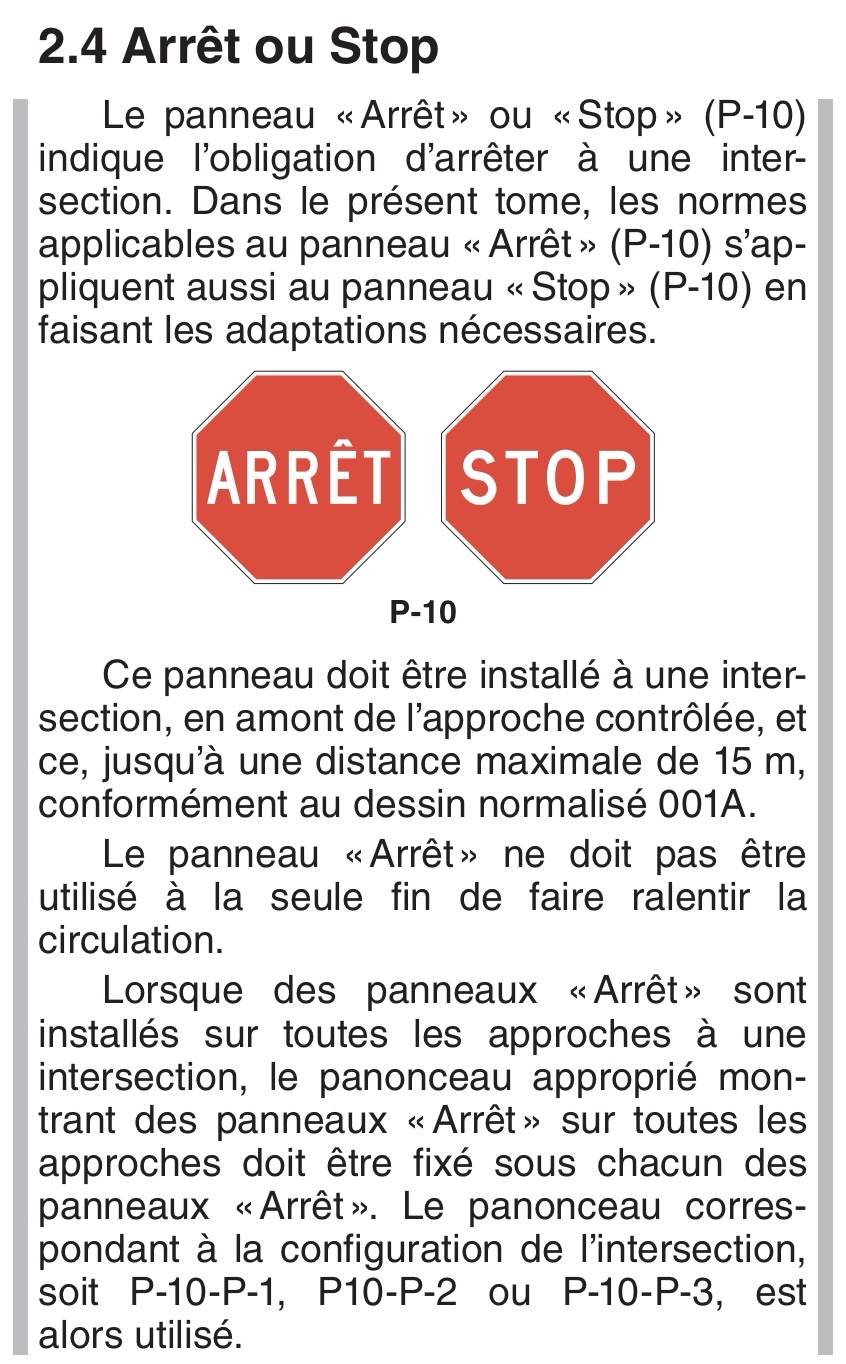 Il faut maintenant retirer l’arrêt temporaire afin de respecter les articles du «Tome V – Signalisation routière» qui présente l’ensemble des normes du ministère des Transports et de la Mobilité durable relatives à la signalisation des routes et des voies cyclables. Ces normes ont été élaborées afin d’établir les exigences du Ministère en matière de signalisation. En vertu de l’article 289 du Code de la sécurité routière du Québec, toute personne responsable de la gestion ou de l’entretien de chemins publics est tenue de se conformer aux normes du présent tome lorsqu’une telle obligation y est indiquée.