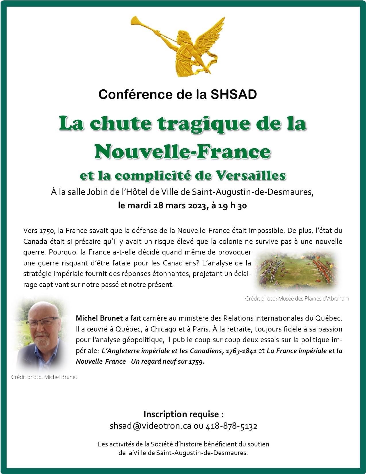 La Société d’histoire de Saint-Augustin-de-Desmaures (SHSAD) vous convie à leur prochaine conférence qui portera sur «La chute tragique de la Nouvelle-France et la complicité de Versailles».