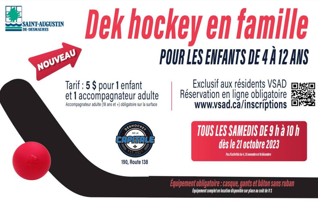 Dès le 21 octobre, les familles augustinoises pourront profiter d’un tarif préférentiel pour une heure de Dek hockey libre tous les samedis au nouveau Complexe DekHockey de la Capitale de Saint-Augustin-de-Desmaures. Il n’en coutera que 5$ pour un enfant de 4 à 12 ans et un accompagnateur adulte.